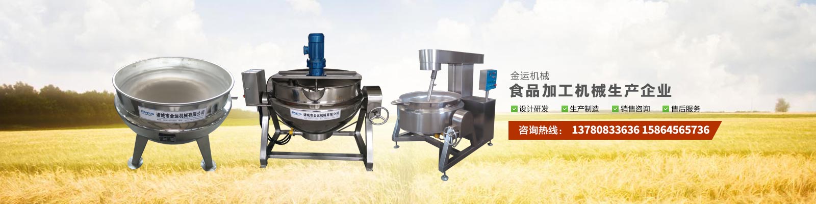 主要產品有:行星攪拌夾層鍋、夾層鍋、壓力煮鍋、各種餡料炒鍋、殺菌鍋(殺菌釜)、巴氏殺菌機、清洗流水線、風干線、真空包裝機、滾揉機、斬拌機、鹽水注射機、大蒜脫皮機、大蒜分瓣機等,廣泛應用于各種食品加工、食品殺菌及農產品深加工、化工、醫藥的生產等??蓾M足外資企業、合資企業及國內大中小企業生產需求,產品暢銷全國各地。